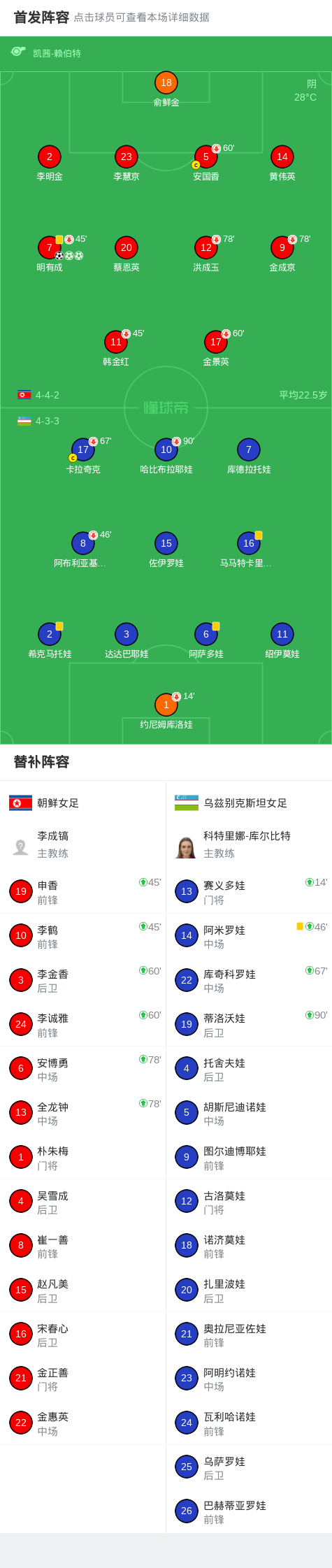 北京时间3月3日女足亚洲杯 小组赛 第1轮,朝鲜女足对阵乌兹别克斯坦女足。朝鲜女足明有成帽子戏法。最终比分朝鲜女足 3-0 乌兹别克斯坦女足。